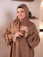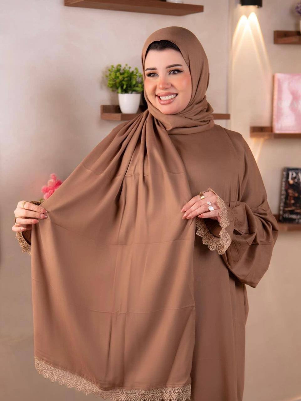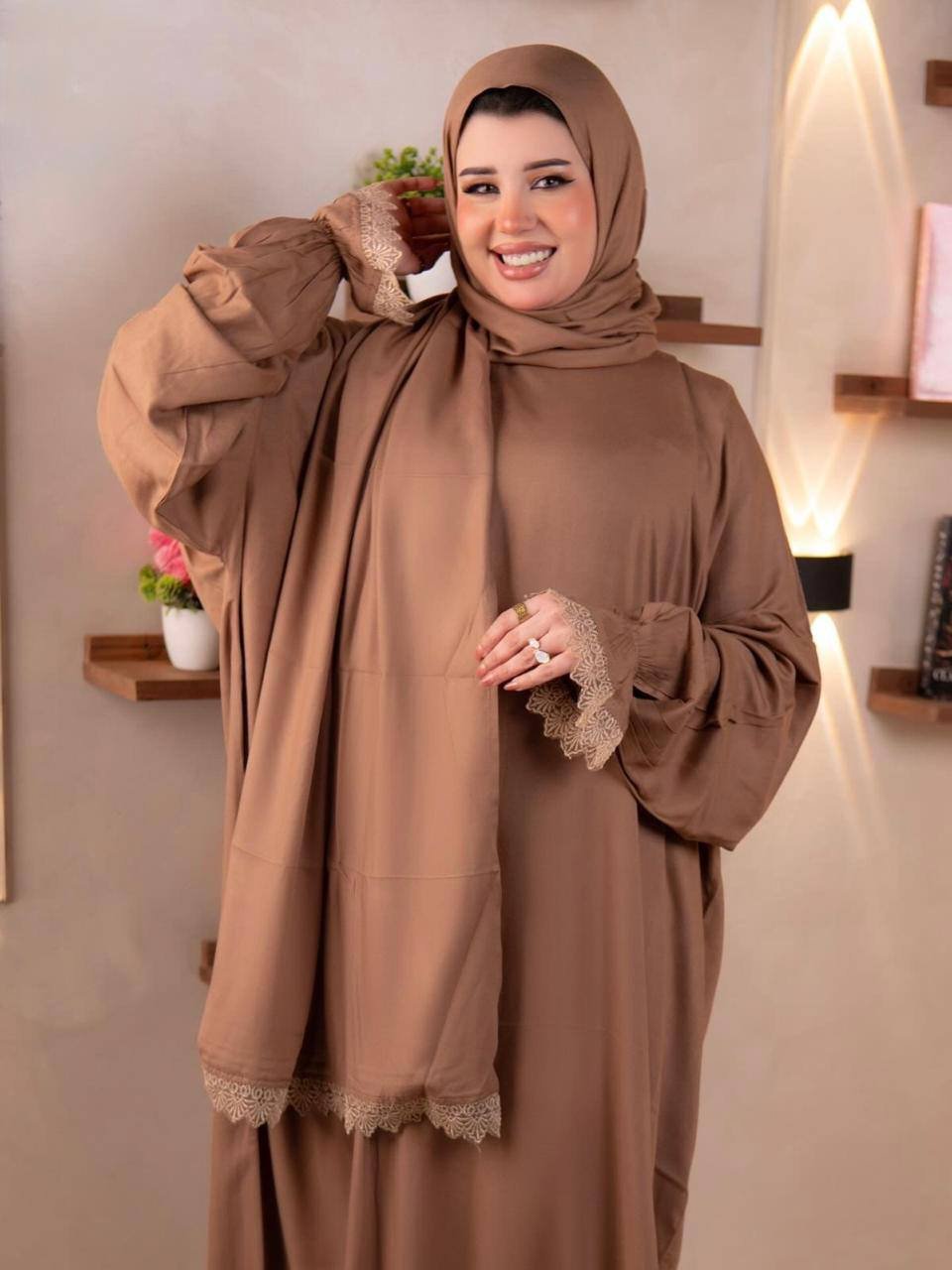 مصنوع من قماش ناعم وخفيف يمنحك راحة طوال اليوم. يتميز بتصميم واسع مع أكمام مزينة بلمسات دانتيل رقيقة على الأطراف، مما يضفي لمسة أنثوية راقية. مثالي للصلاة أو الخروج بإطلالة محتشمة وعصرية في آن واحد.