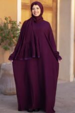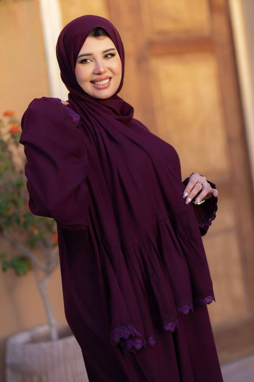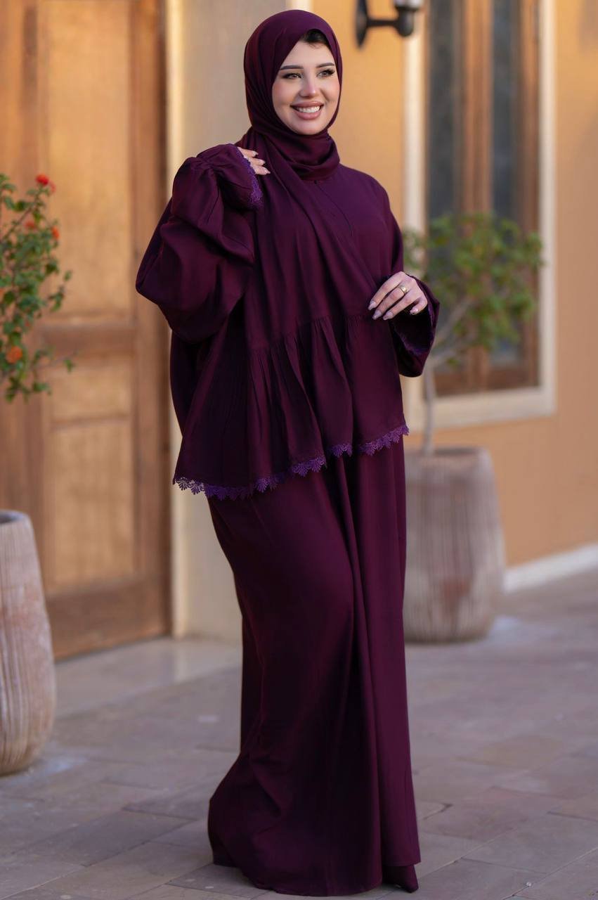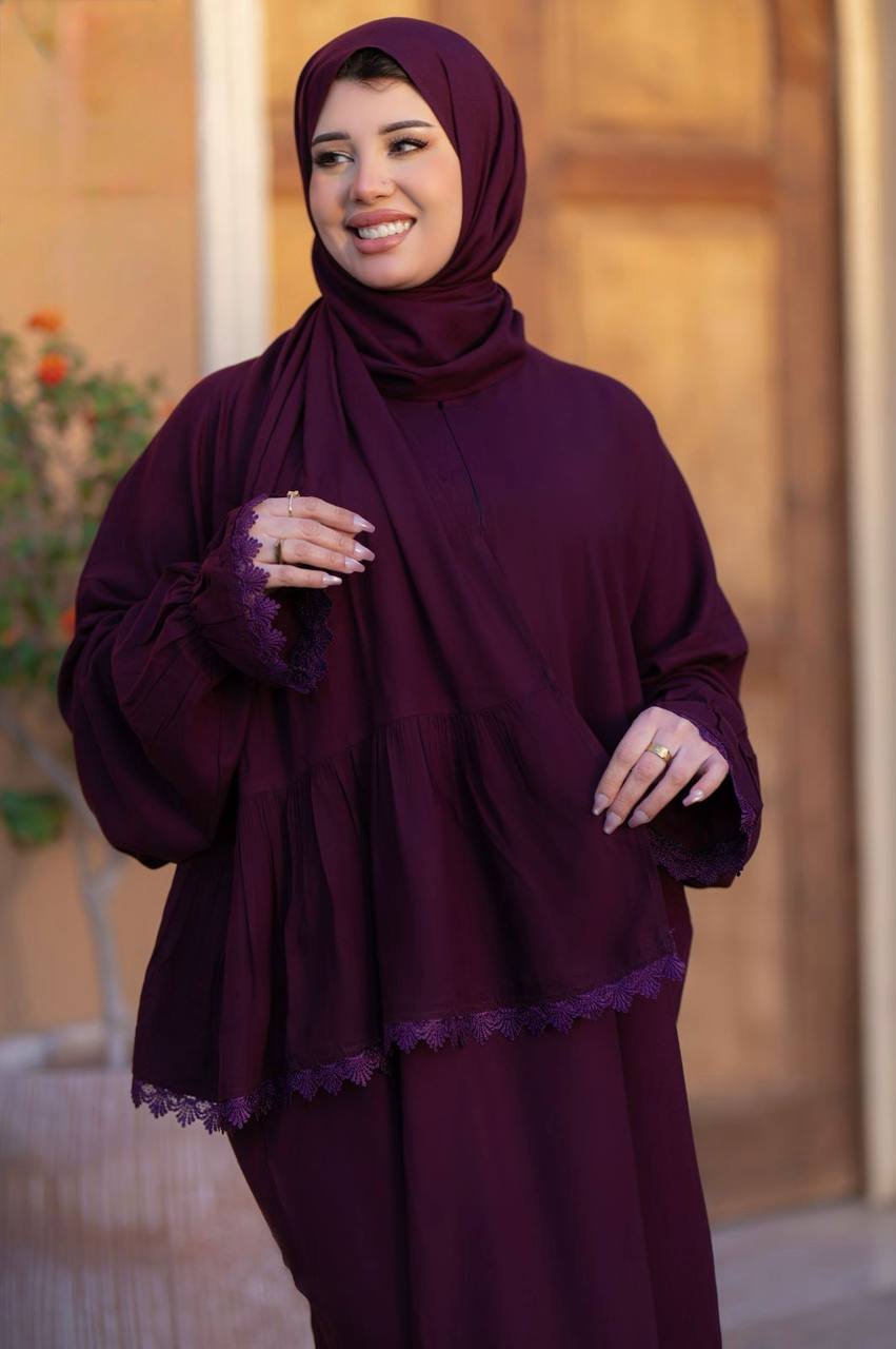 إسدال أنيق بلون برجندي داكن مصنوع من قماش ناعم وخفيف يمنحك راحة طوال اليوم. يتميز بتصميم واسع مع أكمام مزينة بلمسات دانتيل رقيقة على الأطراف، مما يضفي لمسة أنثوية راقية. مثالي للصلاة أو الخروج بإطلالة محتشمة وعصرية في آن واحد.