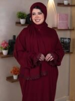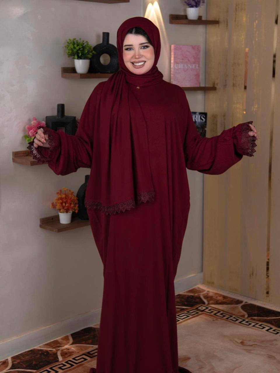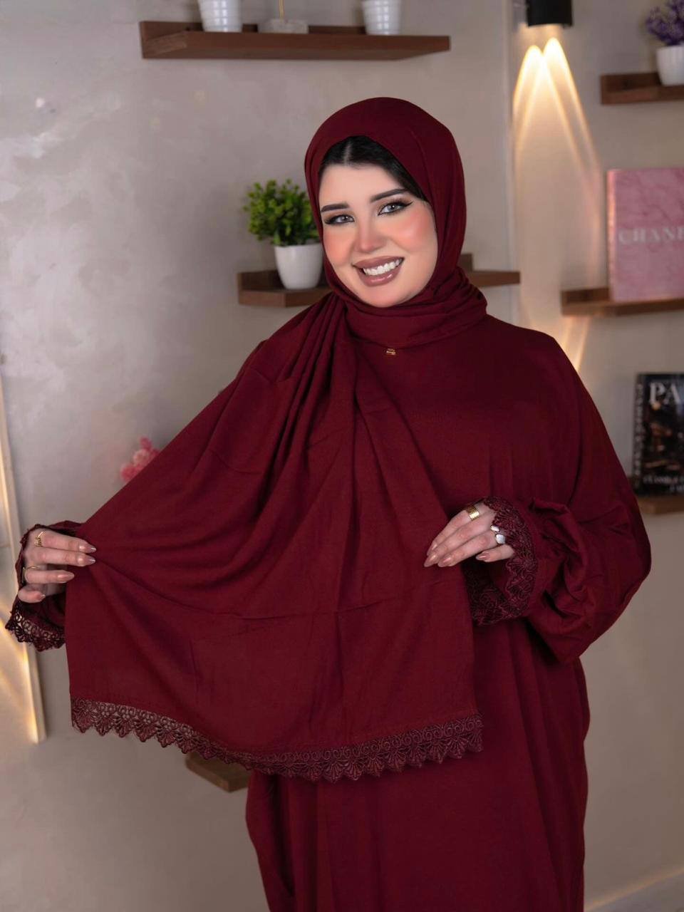 إسدال أنيق بلون خمري داكن مصنوع من قماش ناعم وخفيف يمنحك راحة طوال اليوم. يتميز بتصميم واسع مع أكمام مزينة بلمسات دانتيل رقيقة على الأطراف، مما يضفي لمسة أنثوية راقية. مثالي للصلاة أو الخروج بإطلالة محتشمة وعصرية في آن واحد.