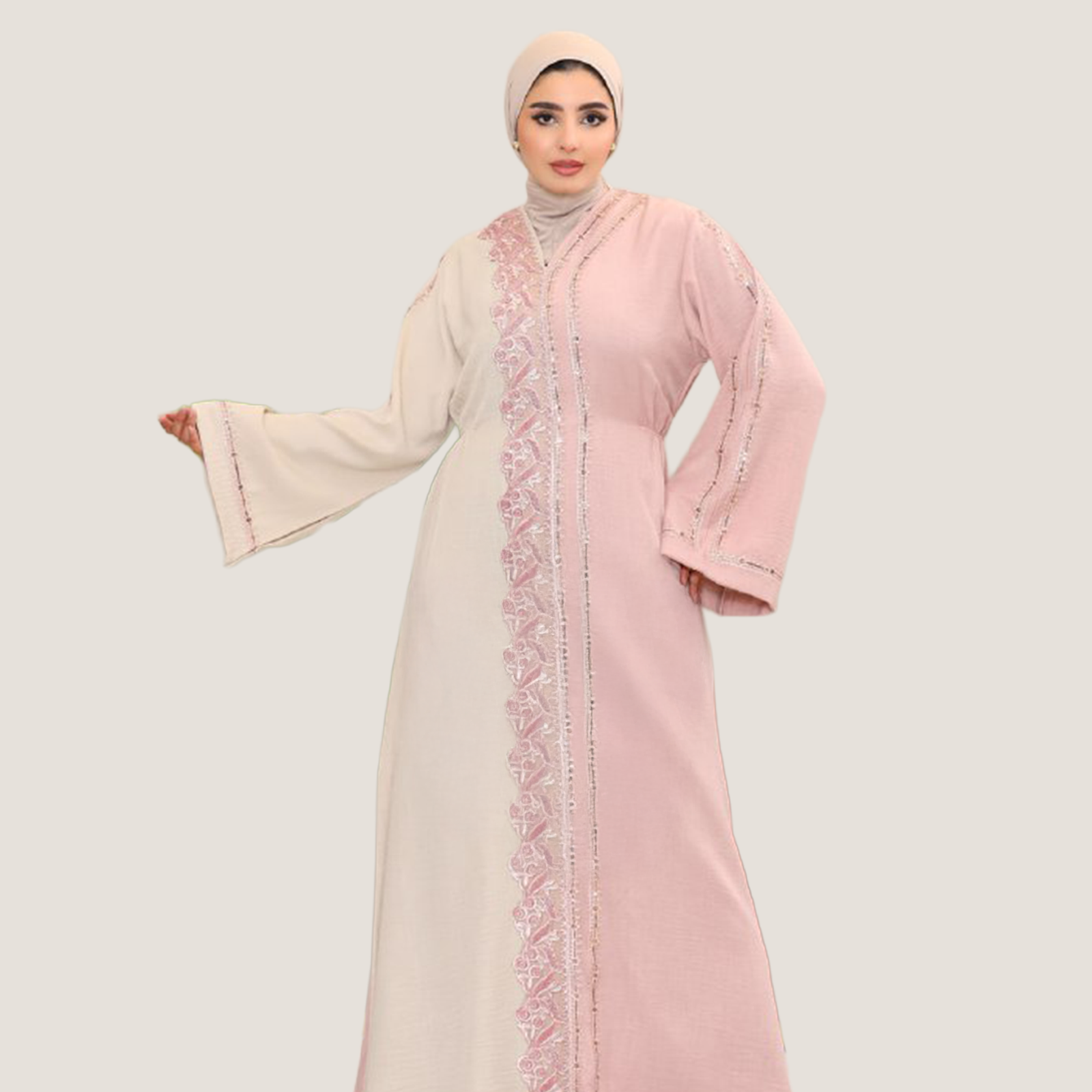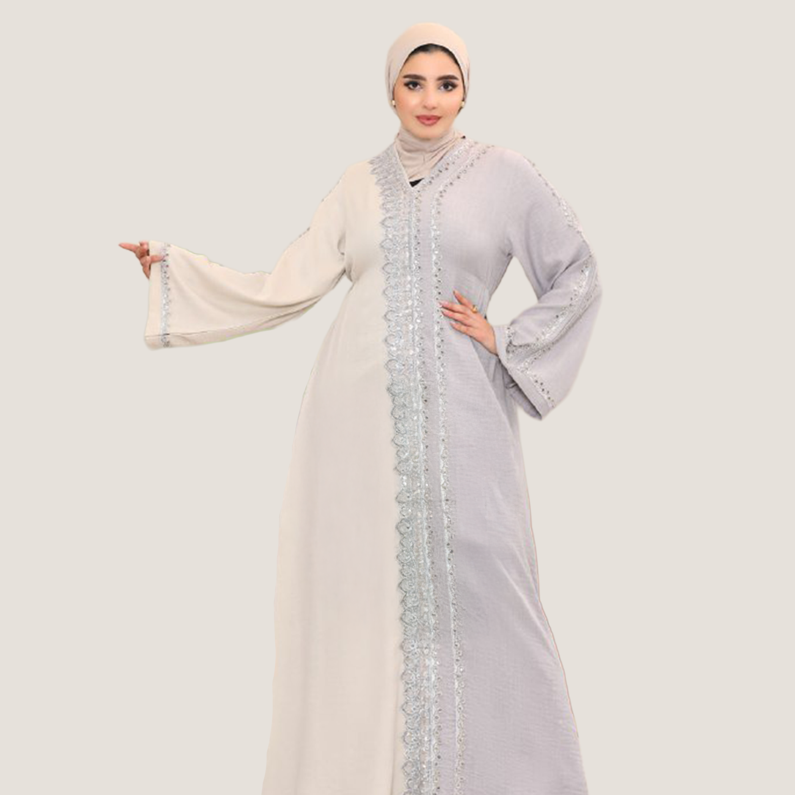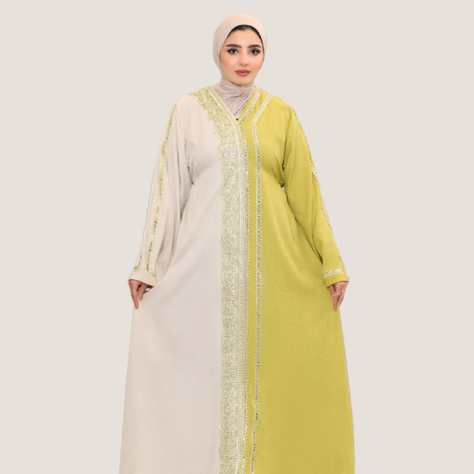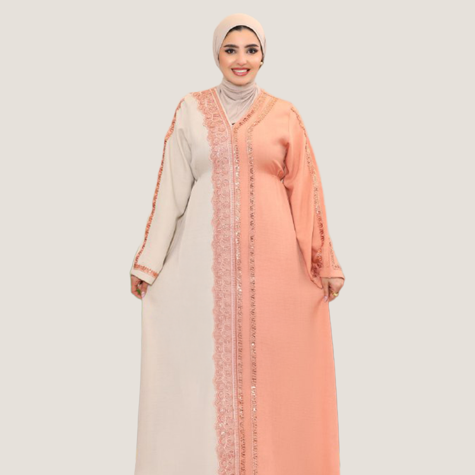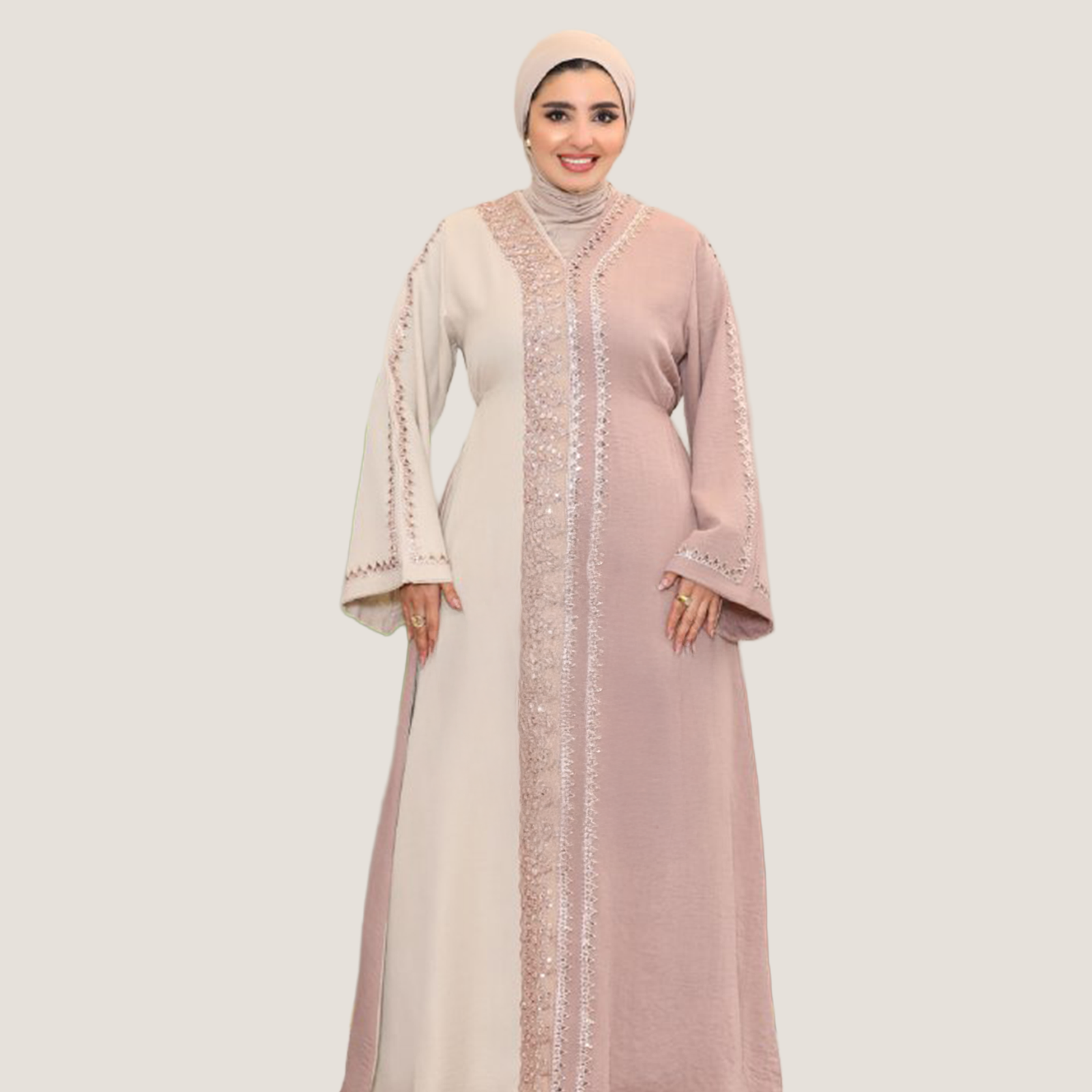 عباية بتصميم أنيق يجمع بين البساطة والرقي، مناسبة لإطلالة عملية وراقية في نفس الوقت، تناسب مختلف الأوقات والمناسبات.