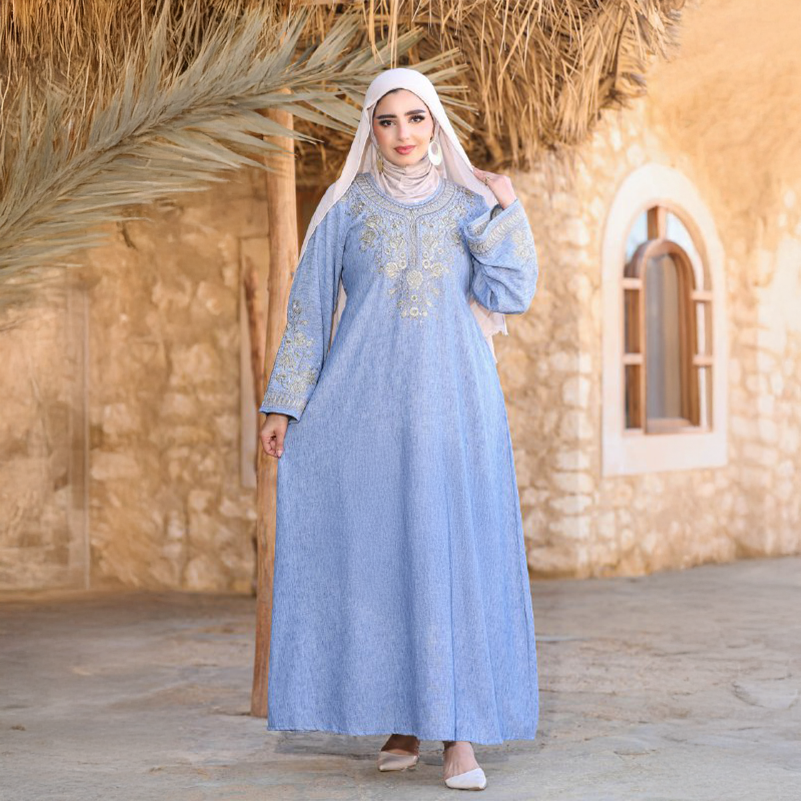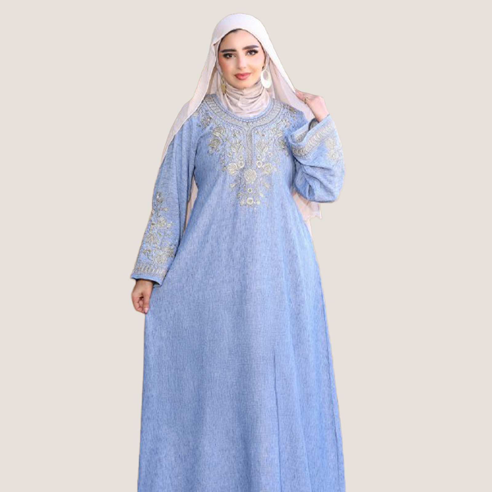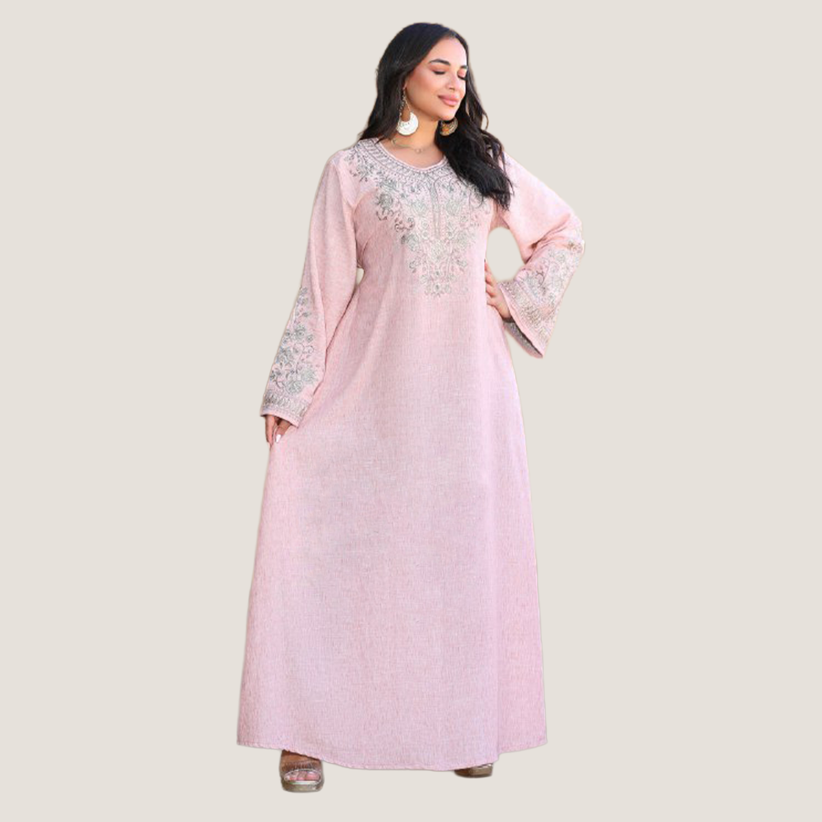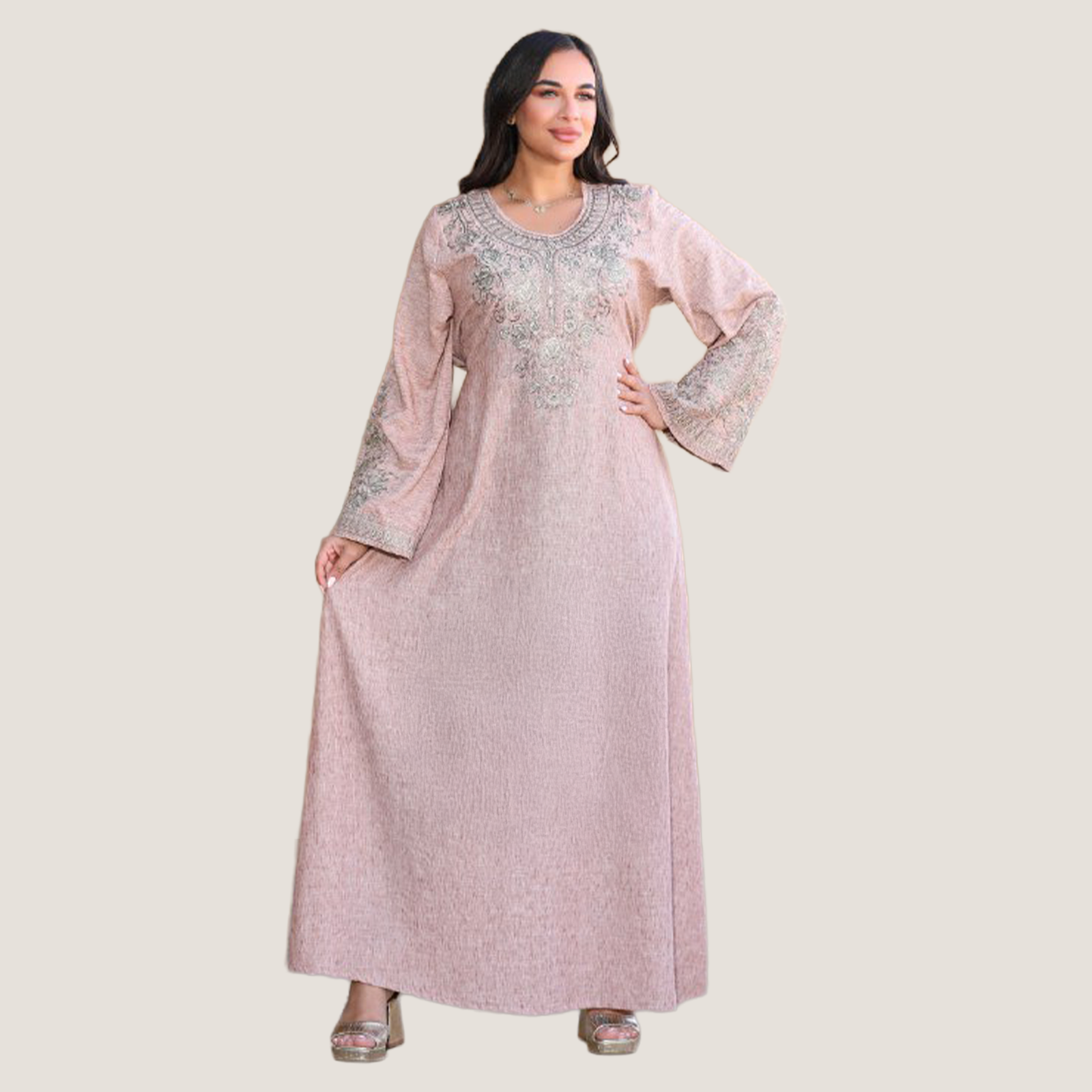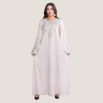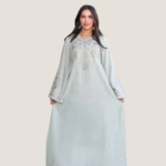 عباية نسائية بخامة كتان إسباني مميزة، مطعّمة بتطريز ستراس يضيف لمسة أناقة وفخامة للموديل. تصميمها شيك ومريح مناسب للخروجات واللبس اليومي، والخامة خفيفة على الجسم وبتدي إحساس بالراحة طول اليوم.