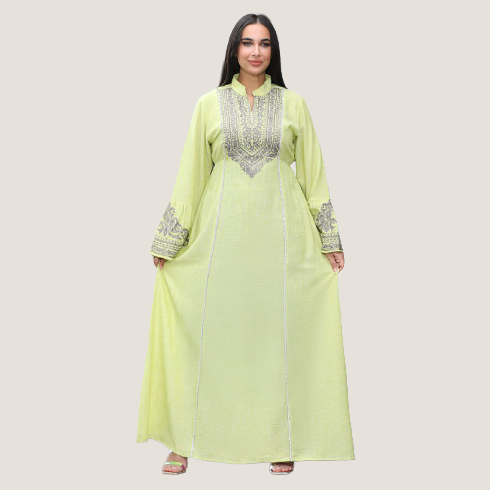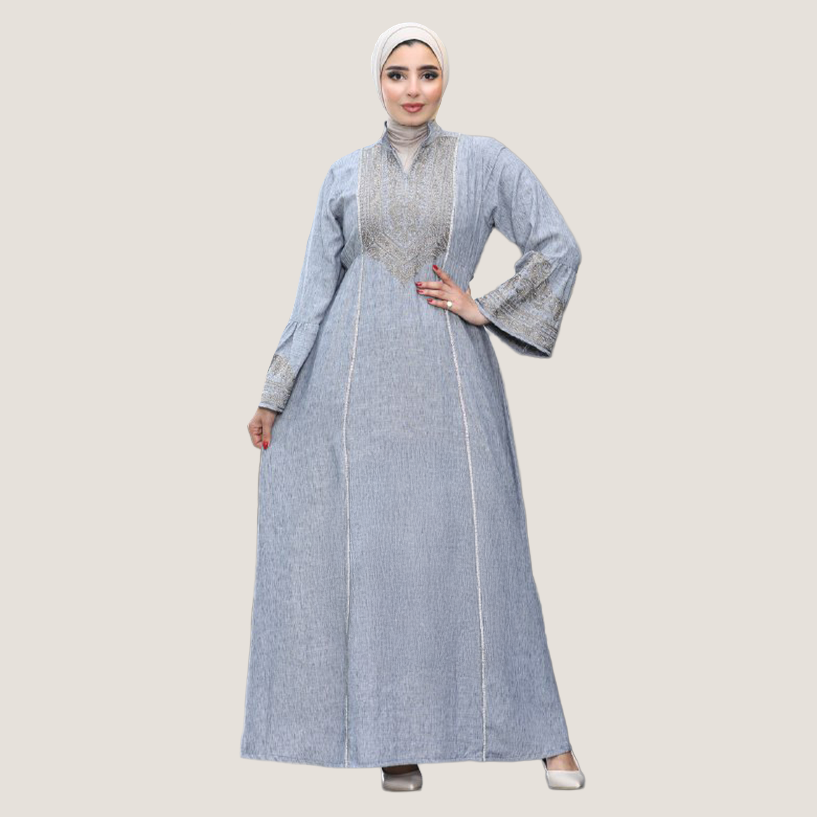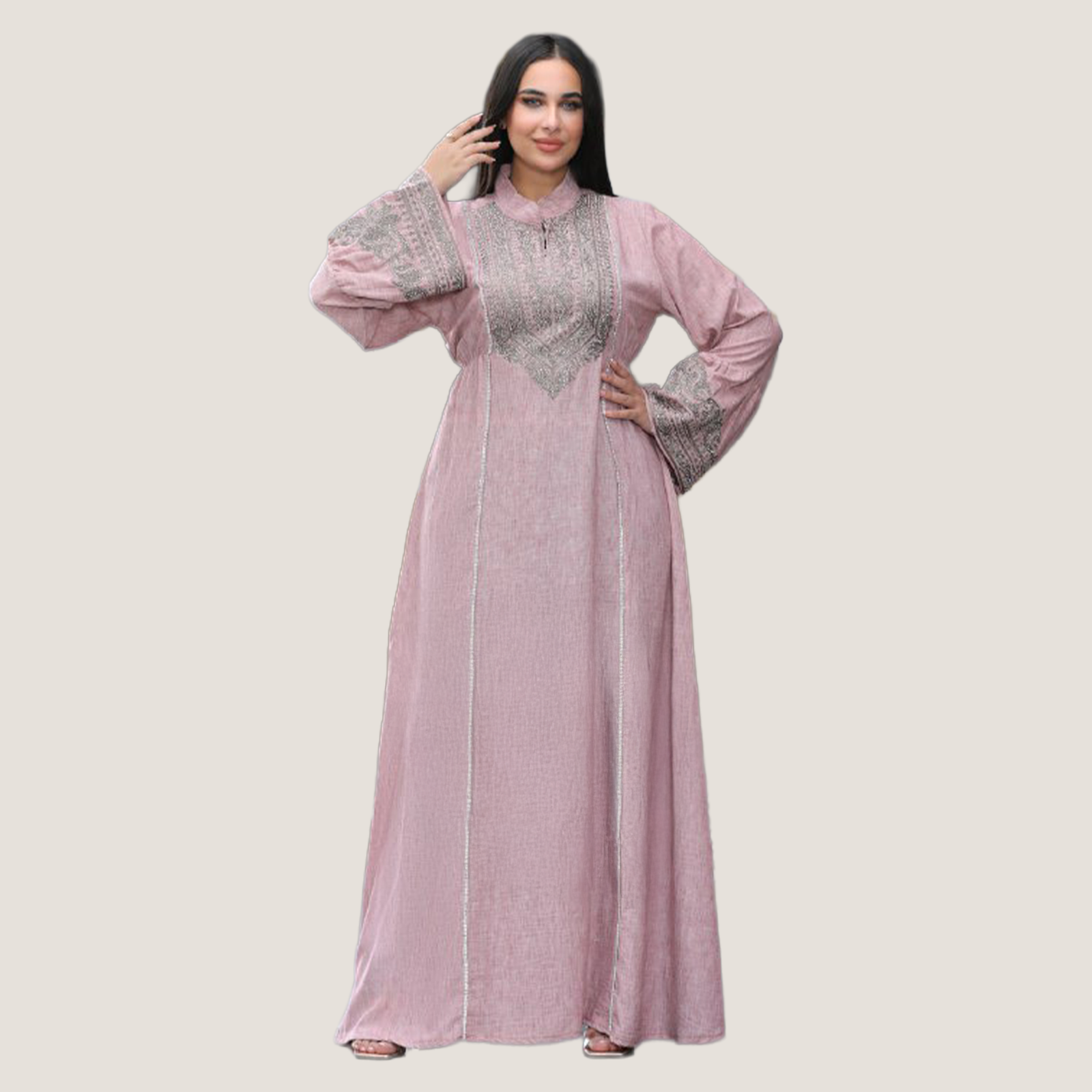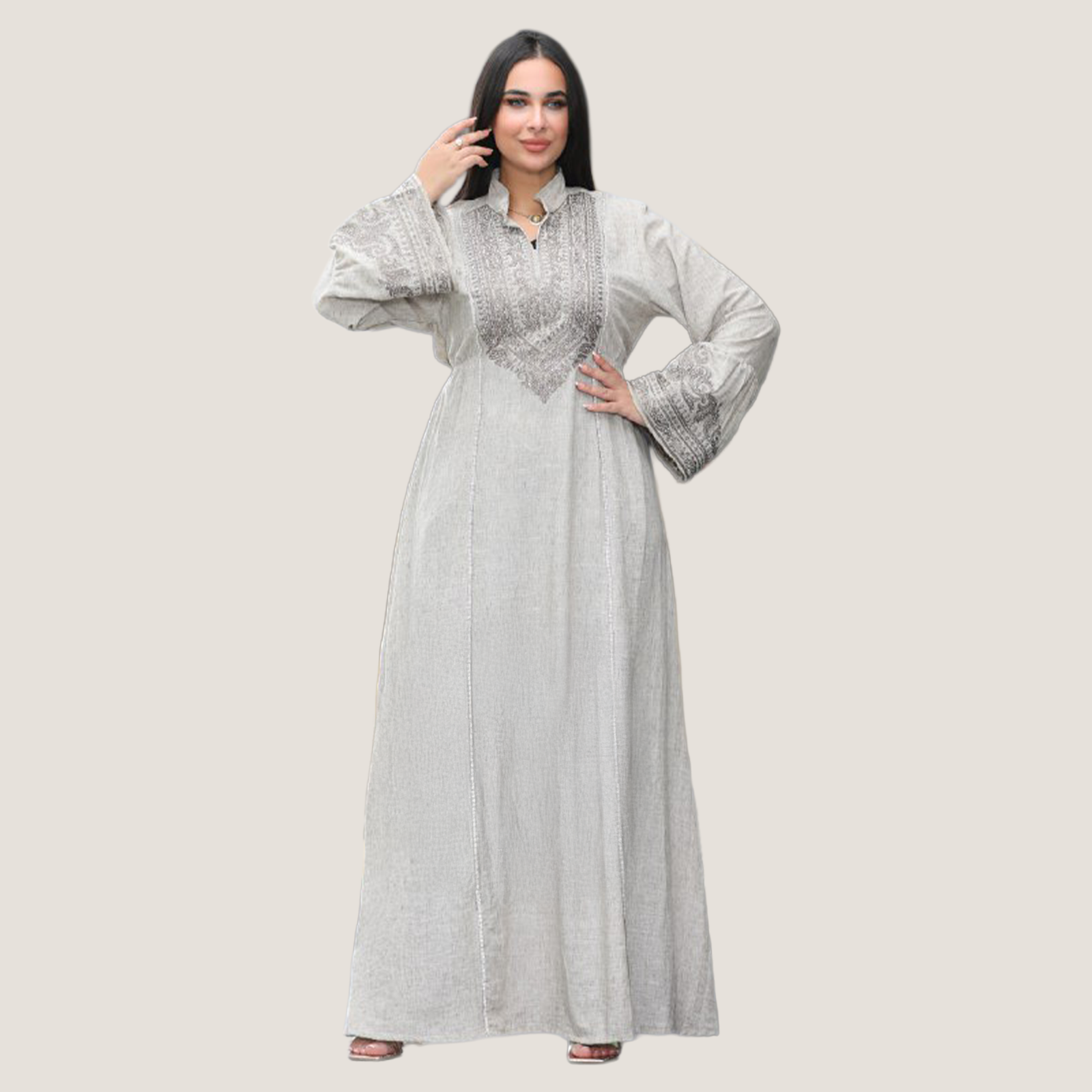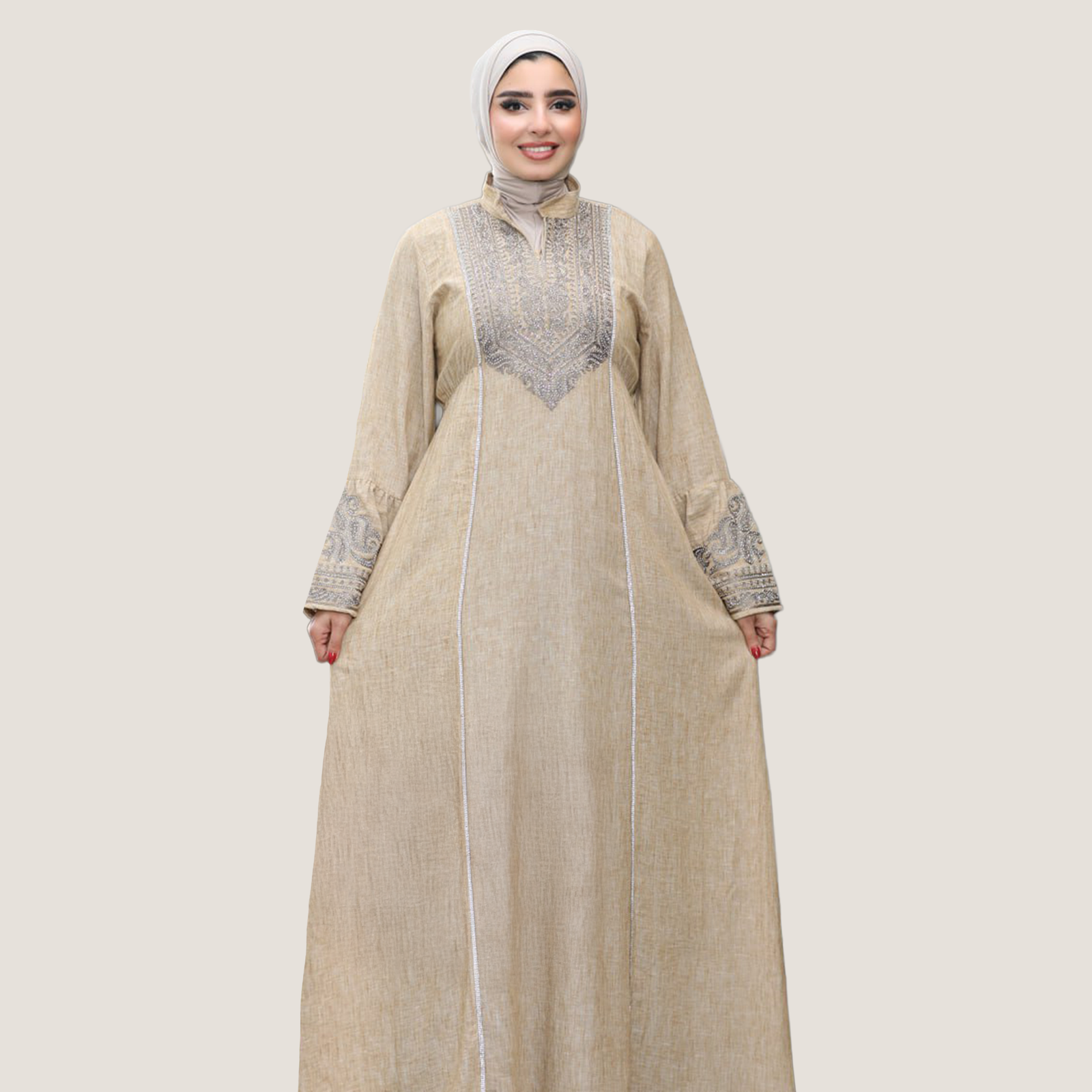 عباية نسائية بخامة كتان إسباني، تصميمها شيك ومريح مناسب للخروجات واللبس اليومي. الخامة خفيفة وناعمة على الجسم وبتدي إحساس بالراحة طول اليوم مع شكل أنيق يبرز جمال الموديل.